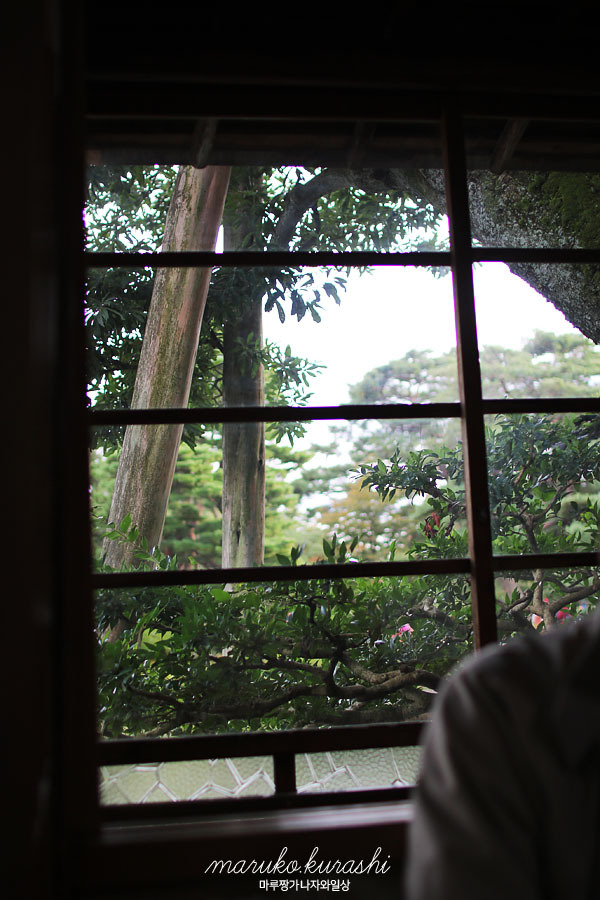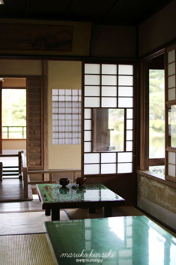연못 위의 작은 공간의 방과 연결되어있는 다리 아래에는 나무로 만든 배가 둥실 떠있었어요. 이러한 구조에서 따와 현재의 "内橋亭"( 우치하 시테이)로 불립니다. 겐로쿠엔의 시초가 된 정원에 있는 건물이라 해 역시나 눈에 보이는 것처럼 분틈 하나하나, 바깥 손잡이 벽 부분 하나하나의 나뭇결에 세월이 묻어난 흔적이 역력했습니다.