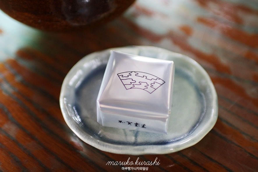 함께 제공되는 것은 加賀宝生 카 가호 쇼, 생 라쿠간에 양갱을 끼워진 것으로 굳이 설명하자면 설탕 묻은 약간 단단한 백설기 같은 느낌의 식감인데 가운데에 양갱이 끼어있는 상태라고 설명하면 딱 좋을 것 같습니다. 백설기와 라쿠간은 비슷할 리 없지만요 일본 전통 과자 중 하나입니다. 씁쓸하고 떫은 맛챠와 굉장히 잘 어울림.