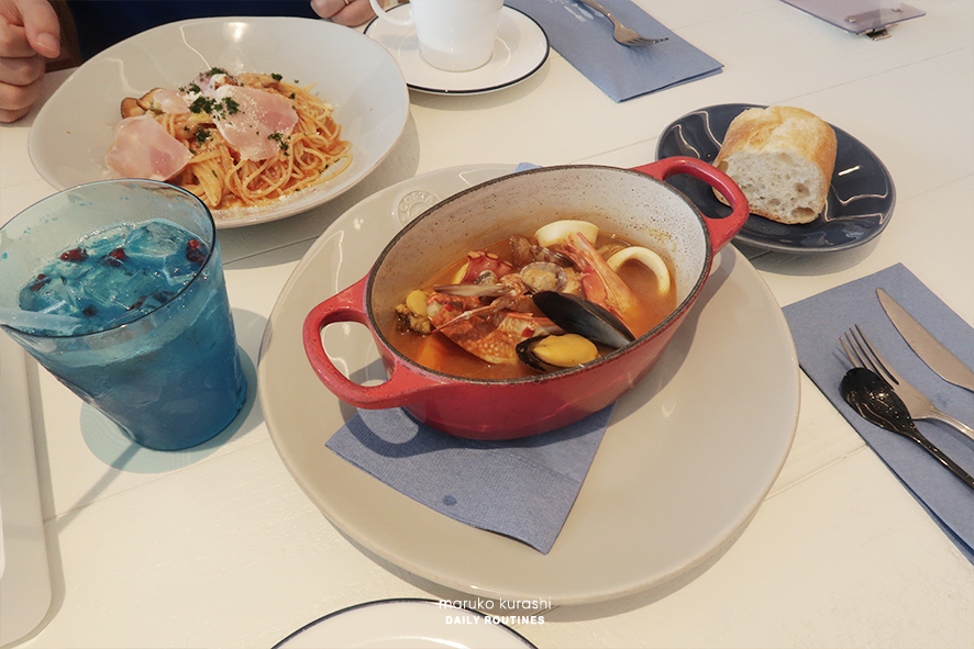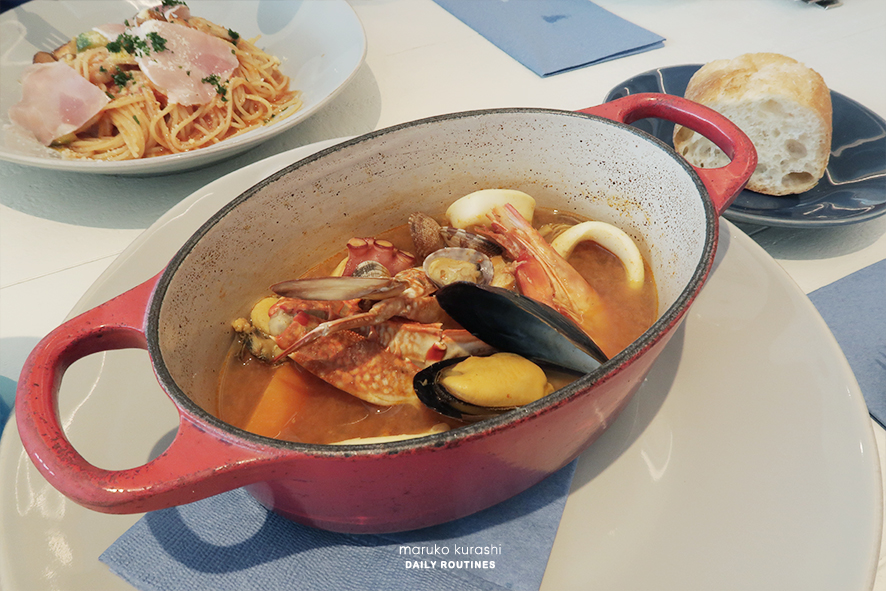 그리고 남편과 주문한 세트가 제공되었어요. 아까 먹었던 식전 모둠샐러드와 그다음 제공되는것이 바로 이 메인 요리들. 남편은 스파게티를 골랐고, 저는 시원한 해산물 국물이 가득한 부야베스를 주문했습니다.