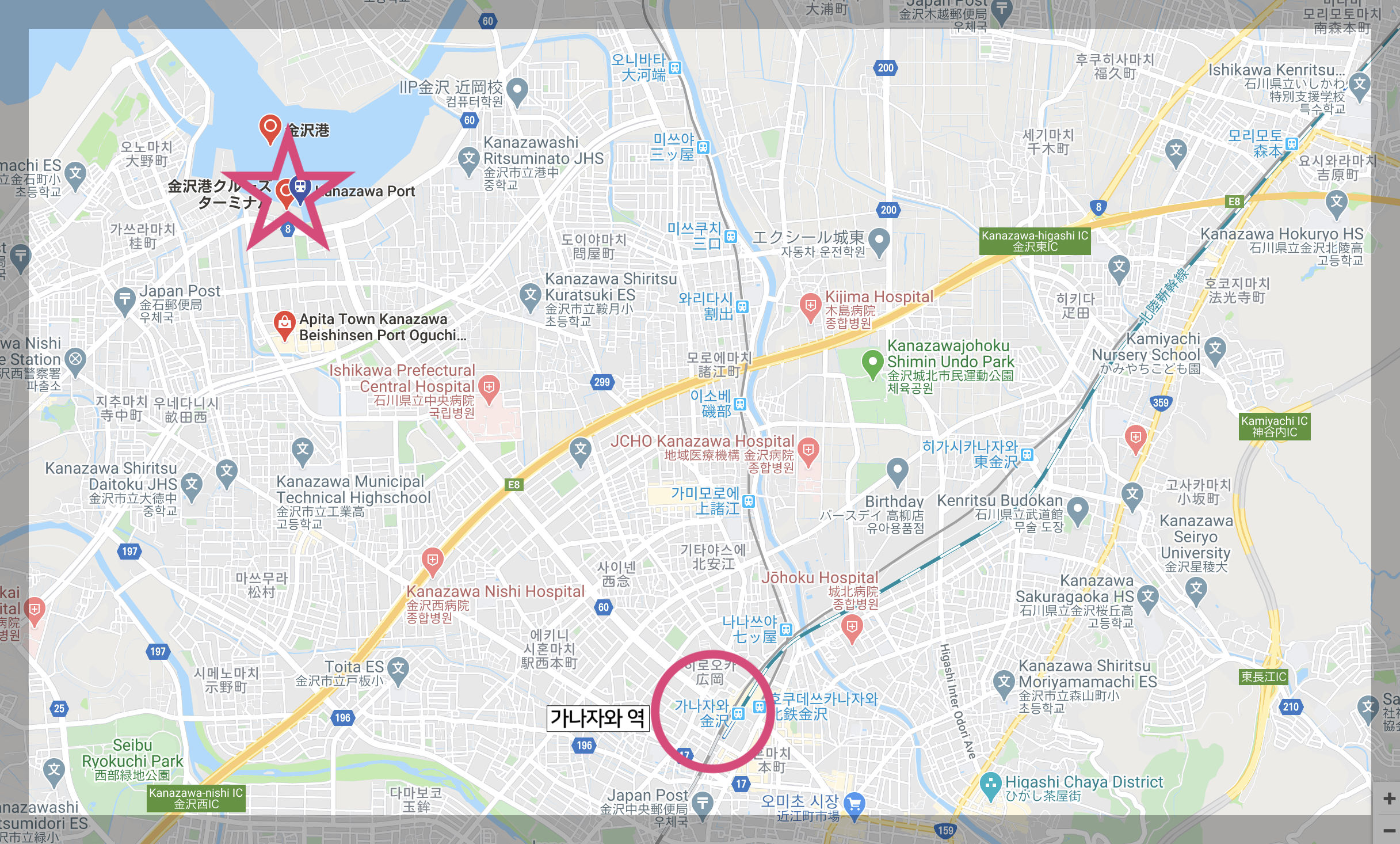 가나자와의 주 관광지에서 떨어진 거리를 이야기해보자면