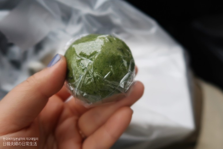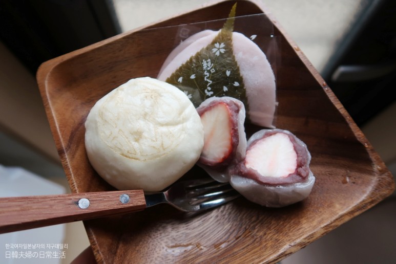 사진에 보이는 소금에 절여 조미된 벚나무 잎으로 싼 분홍빛 모찌, 바로 남편이 너무나 좋아하는 사쿠라 모찌인데요. 안에 들어있는 달콤한 팥이 적당히 짭조름한 벚나무 잎과 맛이 잘 어울려 달콤한 맛이 더 증폭되는 맛있는 모찌예요.