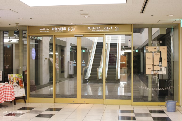 호텔의 로비는 건물의 2층에 위치하고있었고, 1층에는 비지니스맨들도 많이 이용하던 호텔 닛코 오사카의 카페가 있었습니다. 할로윈을 준비하는 고디바 숍도 있었구요. 사실 저희는 지하철을 먼저 타고와서 도착했으므로 위처럼, 지하철에서 빌딩으로 연결되는 에스컬레이터 입구 통로를 이용해서 호텔 로비까지 진입할 수 있었어요. 첫날 도착했을때 저녁약속때문에 정신없이 움직인 탓도있었지만, 여기저기 좀 헤맸던것 같아요. 저 위에 , 호텔 로비 프런트 2F라는 글자만 잘 봤더라면 머릿속에 잘 외웠을텐데 말이예요.