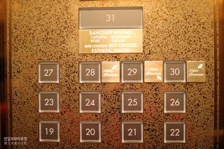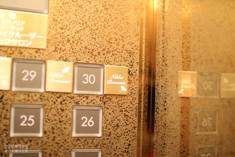 엘레베이터를 탑승하게되면 보이게되는 층간 버튼에 금속으로 「닛코프리미엄」 이라고 표기된 곳이 보이게 되는데요, 앞서 설명된바와같이 닛코 프리미엄 플로어가 2017년부터 리뉴얼되어 객실이 제공되고있기때문에, 4가지 테마의 객실룸 부분은 저렇게 조금 스페셜하게 표기가 되어있더라구요. 저희는 30층에서 투숙하게되었기때문에, 자연스럽게 30층 버튼을 꾸욱- 눌러봅니다.