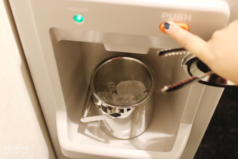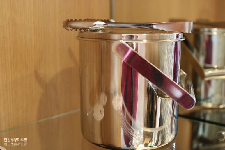 객실에서 가져온 아이스 버캣을 가지고 와서 정수기 처럼 생긴 얼음기계에 내려놓고 push버튼을 누르면 다소 투박하고 큼지막한 얼음들이 차례로 떨어집니다. 너무 편리해서, 얼음 필요할때마다, 특히 남편이 특제 술(?_)을 만들어줄때에 냉큼 가서 편리하게 가지고 올수있어서 너무 좋았어요. 얼음없는곳은 그대로 냉냉 하게 먹어야할때가 많아서 좀 싫을때가 많았숨다...