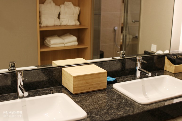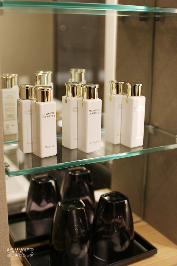 샴프와린스, 바디샴푸는 미키모토 코스메틱의 제품으로 구성되어있으며 정말 하나하나 까기도 아까워죽겠던 아메니티였어요. 테이블 위에 넓다란 상자를 열어보면, 비누, 샤워캡, 그리고 기타 목욕가운, 잠옷, 이마바리 타올 등등, 칫솔, 치약, 빗 , 면도기, 면봉 없는게 없었던 것같아요. 딱 하나 없는게 있었다면, 제가 아이롱기기를 태어나서 처음으로 한국에서 깜빡하고 안가져온 정말 안타까운 순간이었기애, 근처 쇼핑몰에서 정말 저렴한것으로 하나 더 산것 이외에는, 아쉬울 것 없는 욕실, 세면대 였습니다.