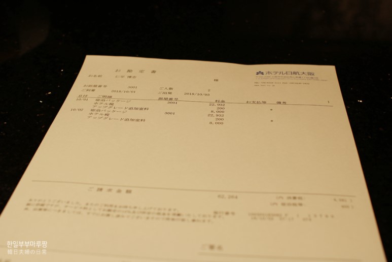 대충 영수증을 보니 저희가 기존에 예약했었던 트윈룸 기준으로 숙박패키지 1박이 2만엔 조금 넘는 금액에, 거기에 직원분으로부터 안내 받았던 객실 업그레이드 8천엔 정도가 추가된것이 바로 결혼 기념 이그제큐티브 스위트룸으로 두단계 업그레이드 되었던 비용 이네요.