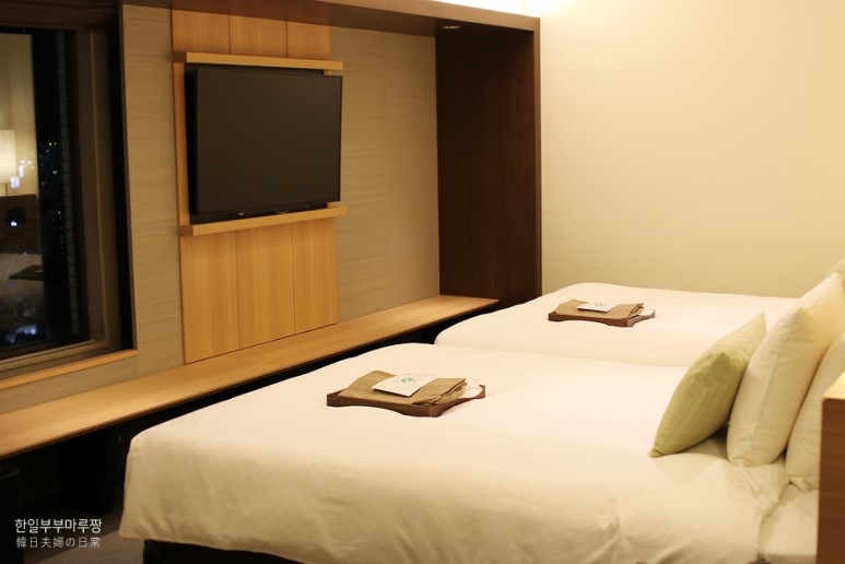 시몬스 침대로 이루어져있는 침실, 침실에도 거실보다는 조금 작은 TV가 설치되어있어요. 이곳에서는 TV를 한번도 켜본적은 없는 것 같아요. 그리고 누워있을때 바깥으로 역시나 오사카의 시내 전경이 보이게되고, 침대 옆 스위치를 누르면, 창문의 브라인드가 자동으로 오르락 내리락 하는것을 조절할 수 있습니다. 2겹으로 되어있고, 2겹 모두 따로따로 작동할수가 있어서, 불투명으로 조절할건지, 반투명상태의 창문상태를 유지할것인지 조절 가능합니다.실내 전등도 물론이거니와.