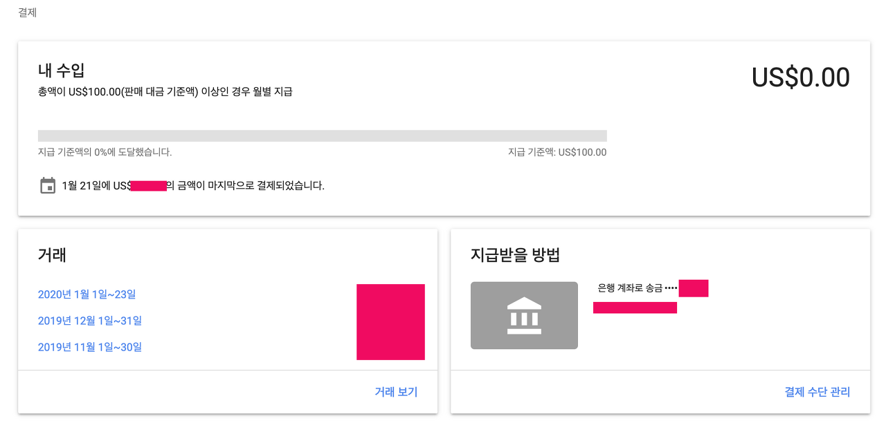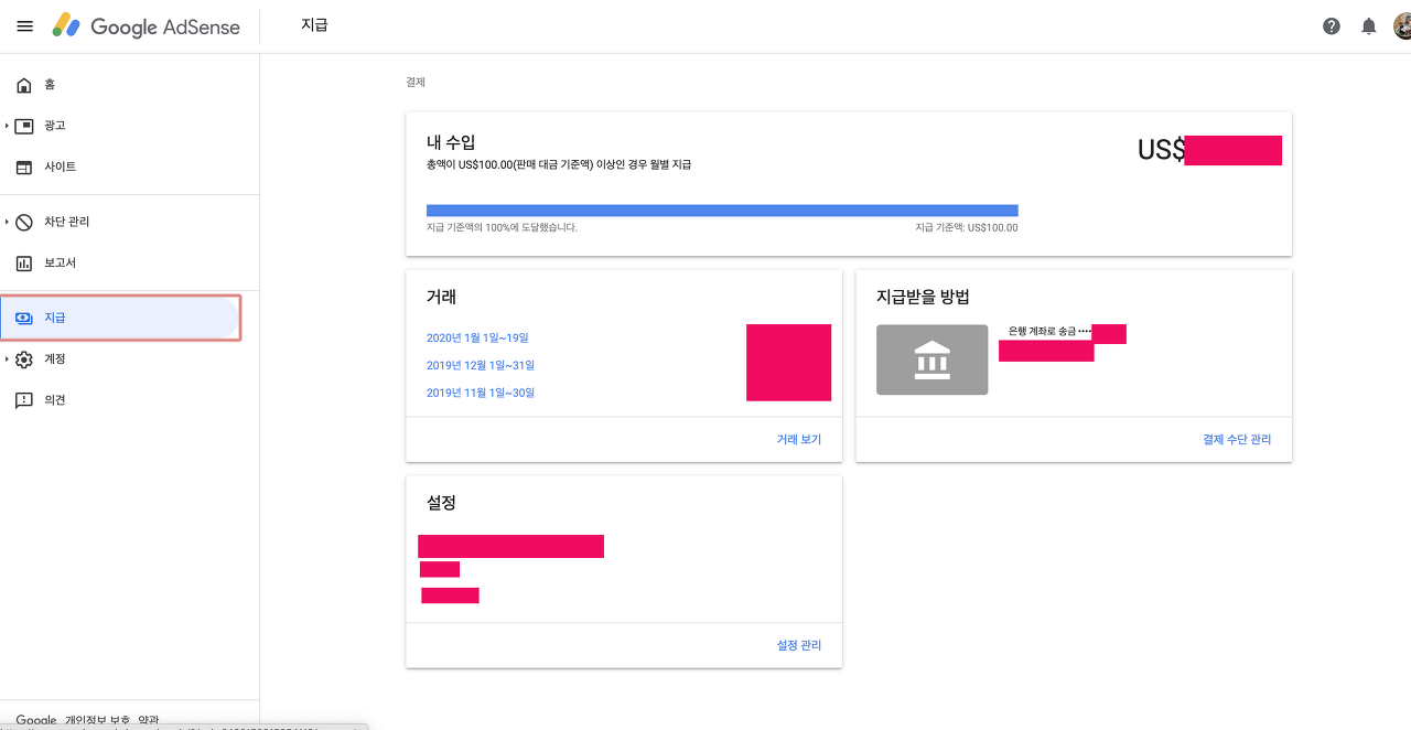 계속 0달러로 떠서 의아했던 애드센스 홈화면 지급 메뉴의 "내 수입" 란에도, 정산일이 되었을 무렵에는 이렇게 100달러가 꽉 차게 파란띠가 생긴것을 볼수 있고, 오른쪽에는 최종 확정 수익이 보이게됩니다. 정산이 되야 이렇게 실로 홈화면에 표기가 된다 라는것을 경험을 통해 알수 있는 순간이었죠.