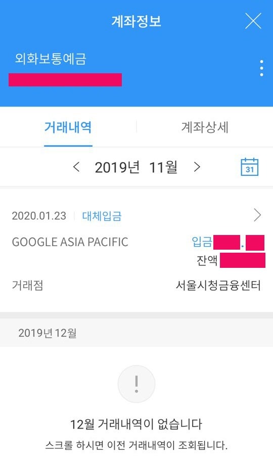 유튜브 수익지급을 확인하기위해서 약 이틀간 매일 점심때와, 그리고 잠들기전인 저녁때 한번씩 확인을 했었습니다. 어차피 외화계좌를 만든 우리은행 알림이 뜨지 않아서 알림이 없으면 안들어왔겠거니, 싶었거든요. 그런데 왠걸, 알림이 없었는데 돈이 들어와있더라구요.