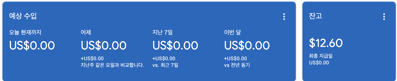 애드센스 홈화면의 오른쪽 파란칸 "잔고" 부분에 표기됨