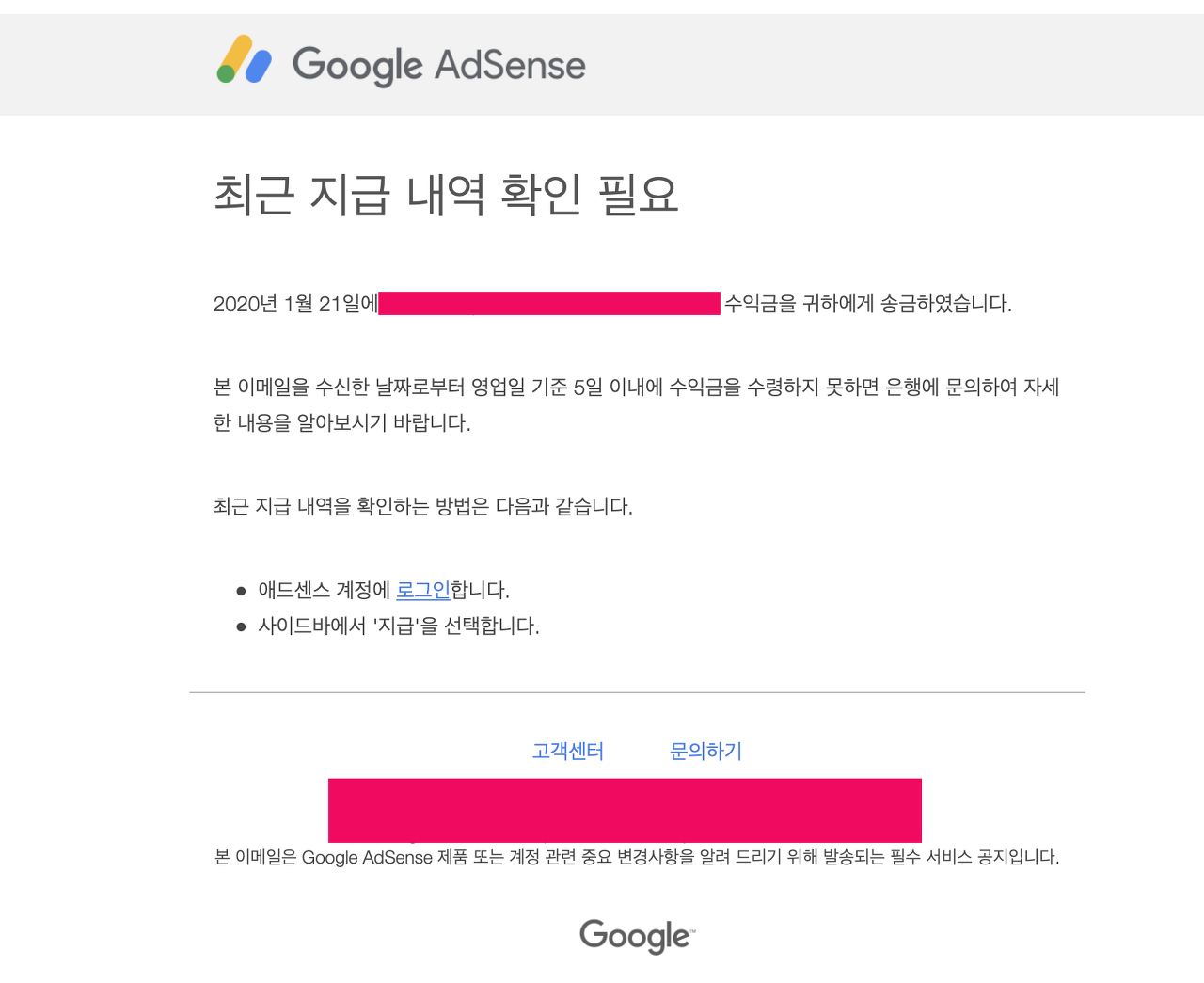 위와 같이 정산을 거친뒤, 그달 21일 구글 이메일을 통해 지급 알림 메일이 옴.