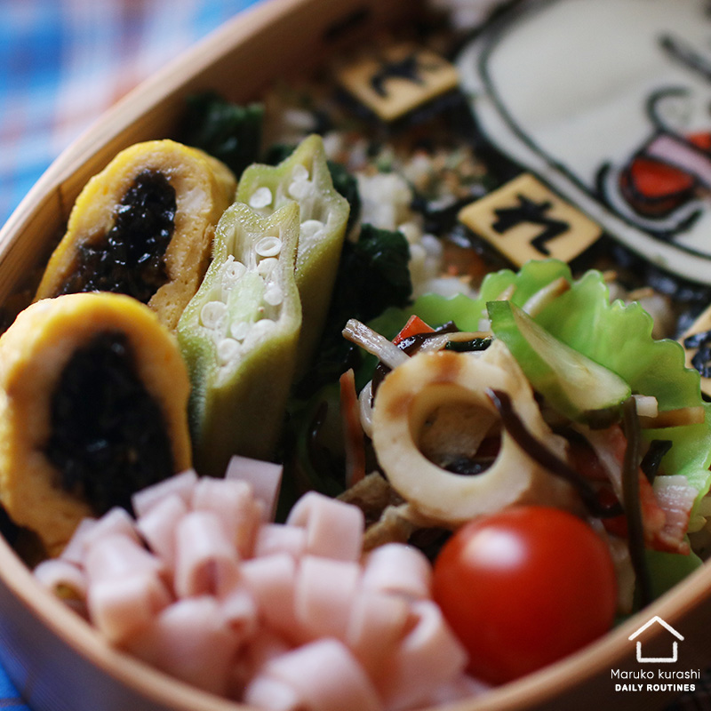 시오콘부는 그만큼 어딘가에 넣고 버무리기만해도 바로 먹을 수 있는 상태이기때문에 식초와 설탕을 섞은 물에 채썬 오이, 맛살, 슬라이스로 썰어낸 치쿠와 등을 넣고 마지막으로 시오콘부를 넣어 버무려 그상태만으로도 여름철 무침 별미가 완성된다. 오늘의 도시락반찬 2번.
