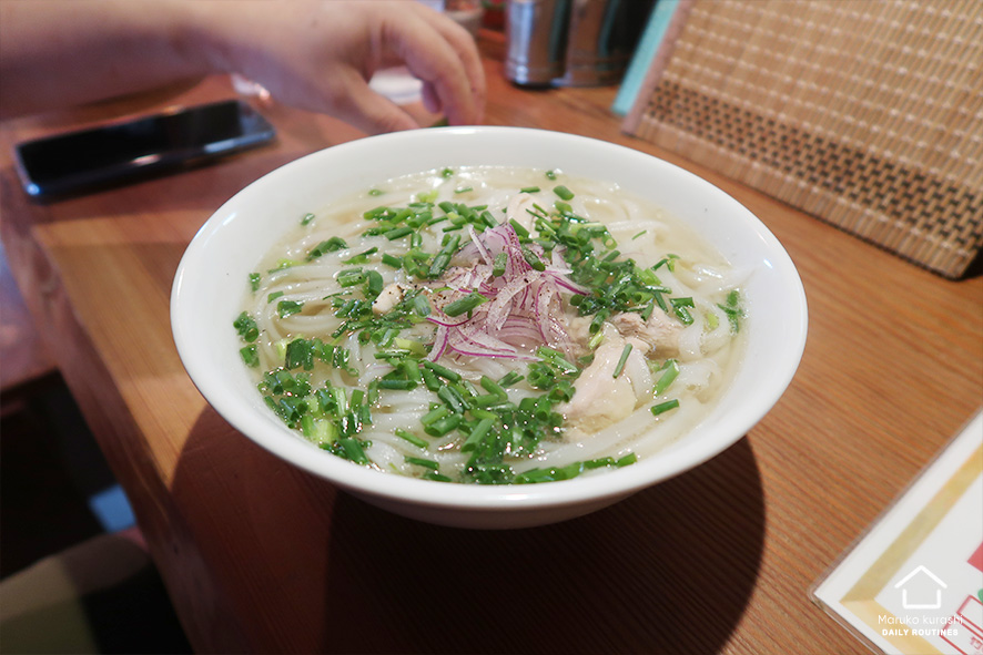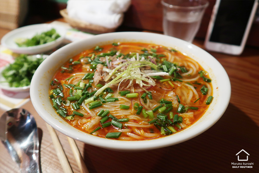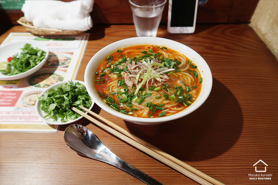 제가 주문한 메뉴는 사장님이 추천하는 ブンボーフエ (분보훼) 베트남 중부에 위치한 フエ(HUE)훼 의 명물 요리라고 해요. 분이라는 쌀가루 국수에 쇠고기와 족발, 레몬의 향과 매운 향긴료를 추가한 깔끔한 맛이 인기인 메뉴였어요. 금액은 870엔. 저역시 금액이 별도 추가되어 오오모리 양으로 주문했어요.