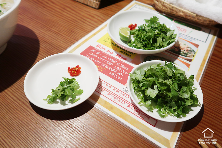 아참, 그리고 60엔을 추가하면 고수를 추가할 수 있는데요, 기본적으로는 고수를 왼쪽의 접시에 공알만하게만 살짝 제공하는것이 기본으로 함께 제공되는 고수의 양인데요, パクチー増し(파쿠치마시) 고수를 추가! 하면 오른쪽의 접시들처럼 한접시 가득 나오게됩니다.
