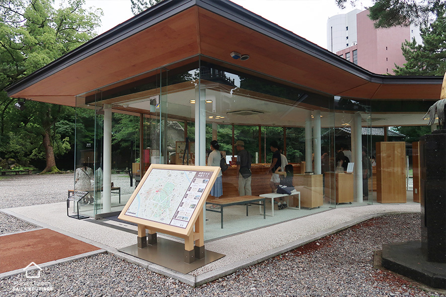 2015년 가을즈음 만들어진, 개방적인 유리디자인의 건물, 시설 내에는 가나자와 성 등 시내 관광지의 사계절의 풍경을 비추는 디스플레이등 가나자와의 금박이 관광상품도 일부 배치되어있는 것을 볼 수 있습니다. 때마침 부슬부슬 비가 내리고 있었는데요, 우산을 미처 챙기지 못한 타지에서 관광온 관광객들이 잠시 비를 피해 내부에 들어가 전시된 것들을 감상하는 모습을 볼 수 있었습니다.