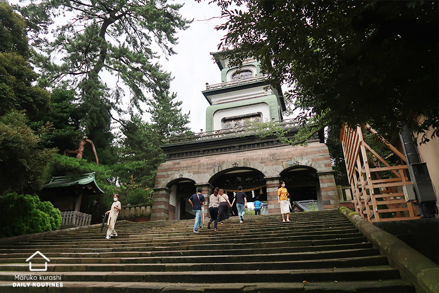 번화가인 코린보 도로를 걷다보면 중간에는 바로 이 오야마신사로 진입하는 계단이 펼쳐진것을 보실 수 있을것입니다. 지난 7월 18일에 완성되어 시민들에게 오픈한 가나자와성의 鼠多門橋 네즈미타몬바시 의 다리로 쉽게 진입할 수 있는 것이 바로 이 오야마 진자를 통해서 가능하게 되었으니 말입니다.