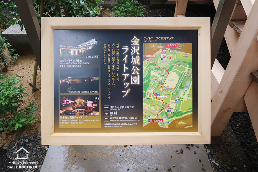 또한 해가 진 뒤부터는 오후 10시까지 라이트업이 시행되고있어서 저녁 나름대로의 분위기를 느낄 수 있습니다. 장소도 장소이니만큼, 겐로쿠엔, 가나자와성에, 더 나아가 쇼핑과 먹거리의 관광도중 부담없이 들를 수 있습니다.